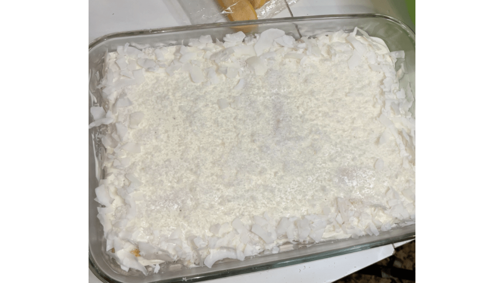 - Smooth the top and sprinkle with shredded coconut or other toppings.